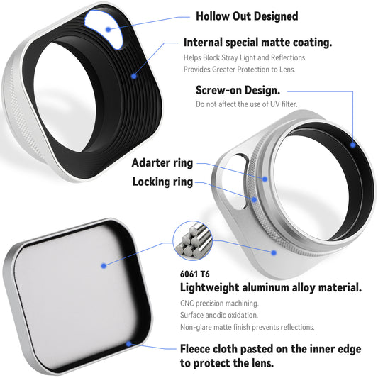 Haoge LH-ES2 49mm Square Metal Screw-in Lens Hood Hollow Out Designed with Cap for Leica Rangefinder Camera with 49mm E49 Filter Thread Lens Silver