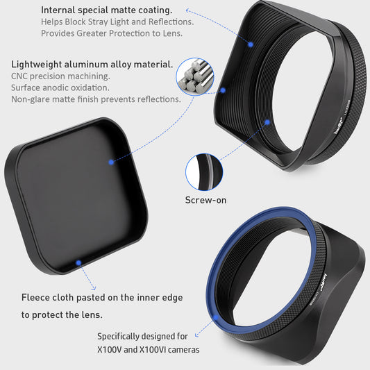 Haoge LH-X200B Square Metal Lens Hood with 49mm Adapter Ring for Fujifilm Fuji X100VI X100V X100F X100T X100S X100 X70 Fuji Photo Camera Accessories Black