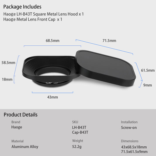 Haoge LH-LC43B 43mm Square Metal Screw-in Lens Hood with Cap for Voigtlander Nokton Classic 35mm f1.4 40mm f/1.4 MC SC VM, Carl Zeiss Biogon T ZM 35mm f2.8 35mm f2, Leica X Typ 113 Lens Black