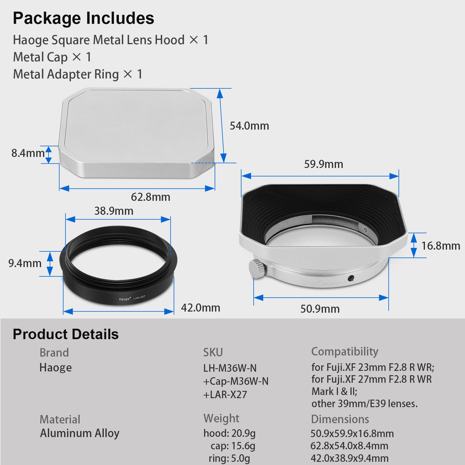 The LH-M36W-N+Cap-M36W-N+LAR-X27 Square Metal Lens Hood and Metal Cap are designed for Leic. Summicron 35mm f2, Summicron-M 35mm f2, Summicron-M 35mm f2 ASPH and Elmarit-M 28mm f2.8 ASPH,for Fujifilm XF 23mm f2.8 XF27mmF2.8 R WR,for Voigtlander ULTRONVINTAGE LINE 35mm F2.0 ASPHERICAL TYPE I & II VM; ULTRONVINTAGE LINE 35mm F1.5 ASPHERICAL TYPE I & II VM;ULTRONVINTAGE LINE 28mm F2 ASPHERICAL TYPE I & II VM;39mm Filter Thread Lense.