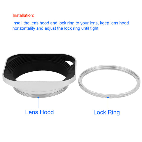 | The Haoge 55mm Square Metal Screw-in Lens Hood with Hollow Out Designed and Metal Cap are specially designed for the lens with 55mm filter size. Features: 55mm Square Metal Screw-in Lens Hood with Cap. With screw mount can be attached to all 55mm lens or filter thread. Designed to minimize lens flare by deflecting stray light from entering lens. Provide additional protection to the camera and lens from accident scratching. Come with metal cap. Hollow Out Designed. Specification: Brand: Haoge Model: LH-W55P Thread: 55mm Material: Metal Color: Silver Compatible with: 55mm Filter Thread Lenses of Canon, Nikon, Sony, Minolta, Pentax, Olympus, Panasonic, Leica, Zeiss, Contax... How to Install: 1. Screw the lens hood and lock ring clockwise into the thread to the end, don't have to tighten it. 2. Rotate lens hood and lock ring anticlockwise, until lens hood horizontality. 3.Keep lens hood horizontality, and rotate the lock ring clockwise until tight. How to uninstall: 1. Keep lens hood steady, and rotate the lock ring anticlockwise until to the end. 2. Rotate lens hood and lock ring anticlockwise, until they are away from the lens or filter. NOTE: the lens hood is compatible with the lenses with 55mm filter size. Please verify your camera's lens thread size before ordering. Your camera's lens thread size will be marked somewhere on the lens barrel or printed underneath your lens cap. This number is always preceded by a "Ø" (diameter) symbol. For example: Ø55 = 55mm lens thread size. Package Included: 1 x Haoge 55mm Square Metal Screw-in Lens Hood with Hollow Out Designed 1 x Metal Cap (Note: this is a Screw-in Hood, not Bayonet Hood) ![]() ![]() ![]() ![]() ![]() ![]()