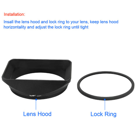 The Haoge 77mm Square Metal Screw-in Lens Hood with Cap is specially designed for all 77mm lens or filter thread. Features: 77mm Square Metal Screw-in Lens Hood with Cap. With screw mount can be attached to all 77mm lens or filter thread. Designed to minimize lens flare by deflecting stray light from entering lens. Provide additional protection to the camera and lens from accident scratching. Specification: Thread: 77mm Material: Metal Color: Black Compatible with: 77mm Filter Thread Lenses of Canon, Nikon, Sony, Minolta, Pentax, Olympus, Panasonic, Leica, Zeiss, Contax... How to Install: 1. Screw the lens hood and lock ring clockwise into the thread to the end, don't have to tighten it. 2. Rotate lens hood and lock ring anticlockwise, until lens hood horizontality. 3.Keep lens hood horizontality, and rotate the lock ring clockwise until tight. How to uninstall: 1. Keep lens hood steady, and rotate the lock ring anticlockwise until to the end. 2. Rotate lens hood and lock ring anticlockwise, until they are away from the lens or filter. NOTE: the lens hood is compatible with all 77mm Thread lenses. Please verify your camera's lens thread size before ordering. Your camera's lens thread size will be marked somewhere on the lens barrel or printed underneath your lens cap. This number is always preceded by a "Ø" (diameter) symbol. For example: Ø77 = 77mm lens thread size. Package Included: 1 x Haoge 77mm Square Metal Screw-in Lens Hood (Note: this is a Screw-in Hood, not Bayonet Hood)