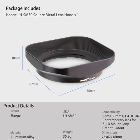 The LH-SM30 Square Metal Lens Hood is designed for Sigma 30mm F1.4 DC DN Lens. This bayonet-mount lens hood shades the lens from stray light, prevent or limit lens flare, improving your contrast and image quality. Provide additional protection to the camera and lens from accident scratching.