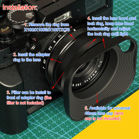 (Note: To use the lens hood, the user has to remove the ring on the top of the lens of camera.)