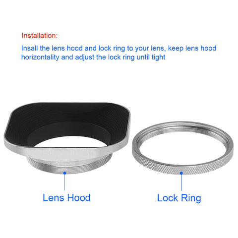 The Haoge 49mm Square Metal Screw-in Lens Hood and Metal Cap are specially designed for all 49mm lens or filter thread. Features: 49mm Square Metal Screw-in Lens Hood with Cap. With screw mount can be attached to all 49mm lens or filter thread. Designed to minimize lens flare by deflecting stray light from entering lens. Provide additional protection to the camera and lens from accident scratching. Come with metal cap. Specification: Brand: Haoge Model: LH-EW2 Thread: 49mm Material: Metal Color: Silver Compatible with: 49mm Filter Thread Lenses of Canon, Nikon, Sony, Minolta, Pentax, Olympus, Panasonic, Leica, Zeiss, Contax... Installation: Insall the lens hood and lock ring to your lens, keep lens hood horizontality and adjust the lock ring until tight NOTE: the lens hood is compatible with all 49mm lenses. Please verify your camera's lens thread size before ordering. Your camera's lens thread size will be marked somewhere on the lens barrel or printed underneath your lens cap. This number is always preceded by a "Ø" (diameter) symbol. For example: Ø49 = 49mm lens thread size. Package Included: 1 x Haoge 49mm Square Metal Screw-in Lens Hood 1 x Metal Cap (Note: this is a Screw-in Hood, not Bayonet Hood)