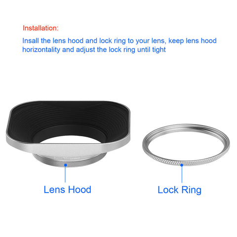 The Haoge 43mm Square Metal Screw-in Lens Hood and Metal Cap are specially designed for all 43mm lens or filter thread. Features: 43mm Square Metal Screw-in Lens Hood with Cap. With screw mount can be attached to all 43mm lens or filter thread. Designed to minimize lens flare by deflecting stray light from entering lens. Provide additional protection to the camera and lens from accident scratching. Come with metal cap. Specification: Brand: Haoge Model: LH-LC43W Thread: 43mm Material: Metal Color: Silver Compatible with: 43mm Filter Thread Lenses of Canon, Nikon, Sony, Minolta, Pentax, Olympus, Panasonic, Leica, Zeiss, Contax... Installation: Insall the lens hood and lock ring to your lens, keep lens hood horizontality and adjust the lock ring until tight NOTE: the lens hood is compatible with all 43mm lenses. Please verify your camera's lens thread size before ordering. Your camera's lens thread size will be marked somewhere on the lens barrel or printed underneath your lens cap. This number is always preceded by a "Ø" (diameter) symbol. For example: Ø43 = 43mm lens thread size. Package Included: 1 x Haoge 43mm Square Metal Screw-in Lens Hood 1 x Metal Cap (Note: this is a Screw-in Hood, not Bayonet Hood)
