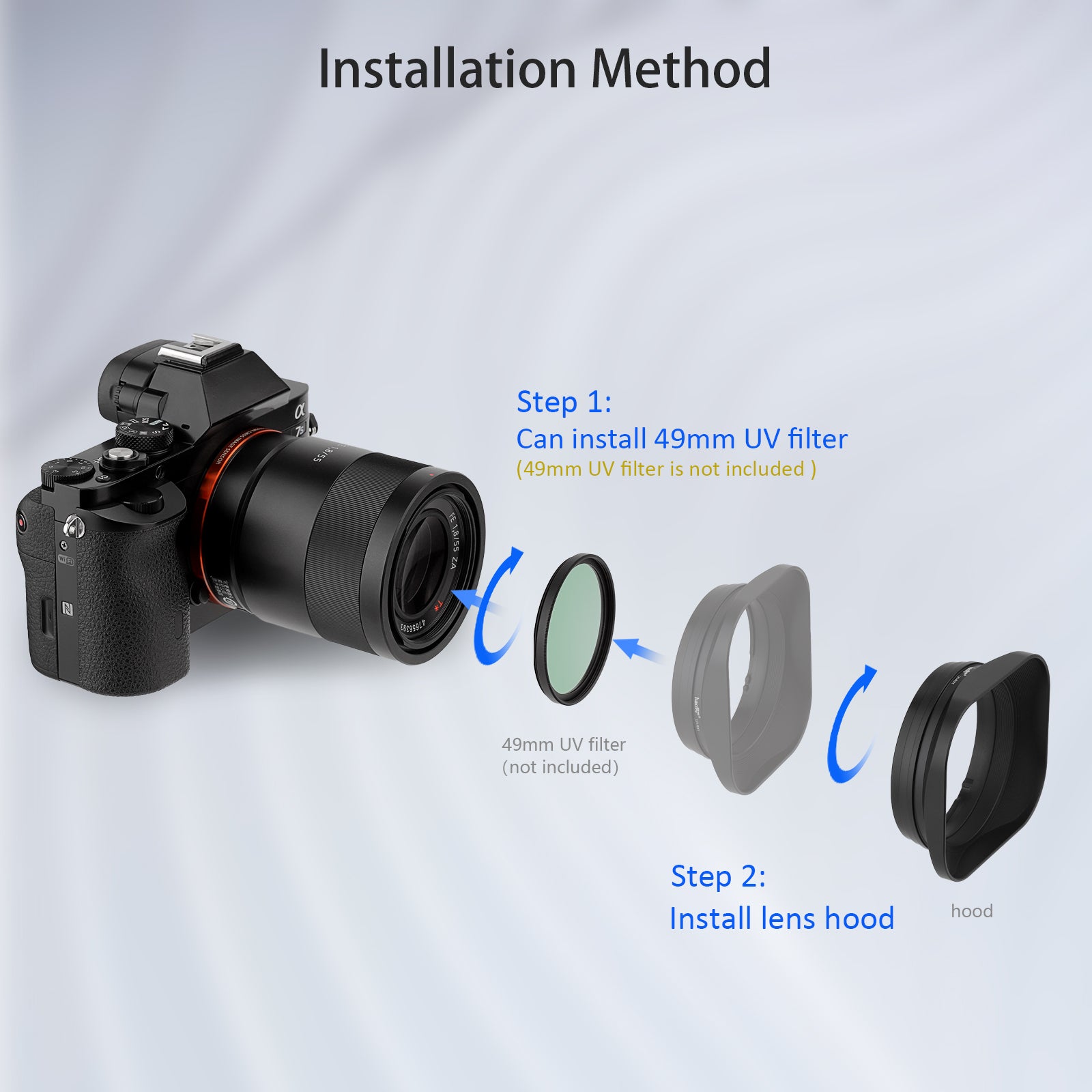 The LH-RX1 Metal Lens Hood is designed for Sony Carl Zeiss Sonnar T* FE 24mm F1.8 ZA,FE 35mm F2.8 ZA,FE 55mm F1.8 ZA Lens. This bayonet-mount lens hood shades the lens from stray light, prevent or limit lens flare, improving your contrast and image quality. Provide additional protection to the camera and lens from accident scratching.