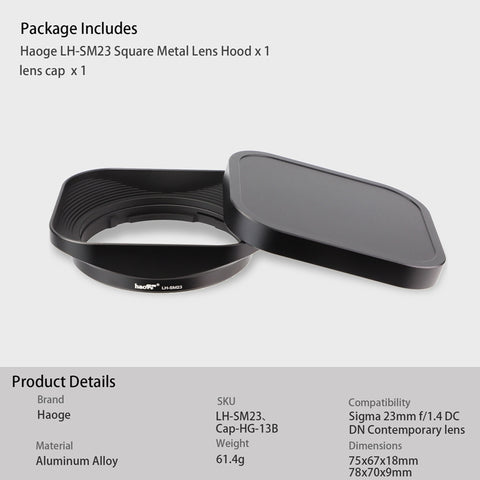 Haoge LH-SM23+Cap-HG-13B Bayonet Square Metal Lens Hood with Metal Cap for Sigma 23mm F1.4 DC DN Lens