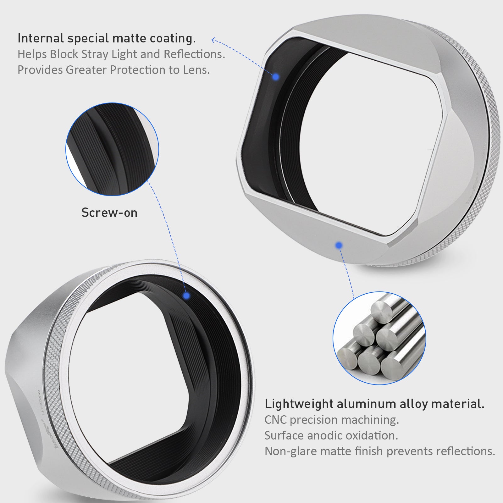 Anodized alumium made metal lens hood.