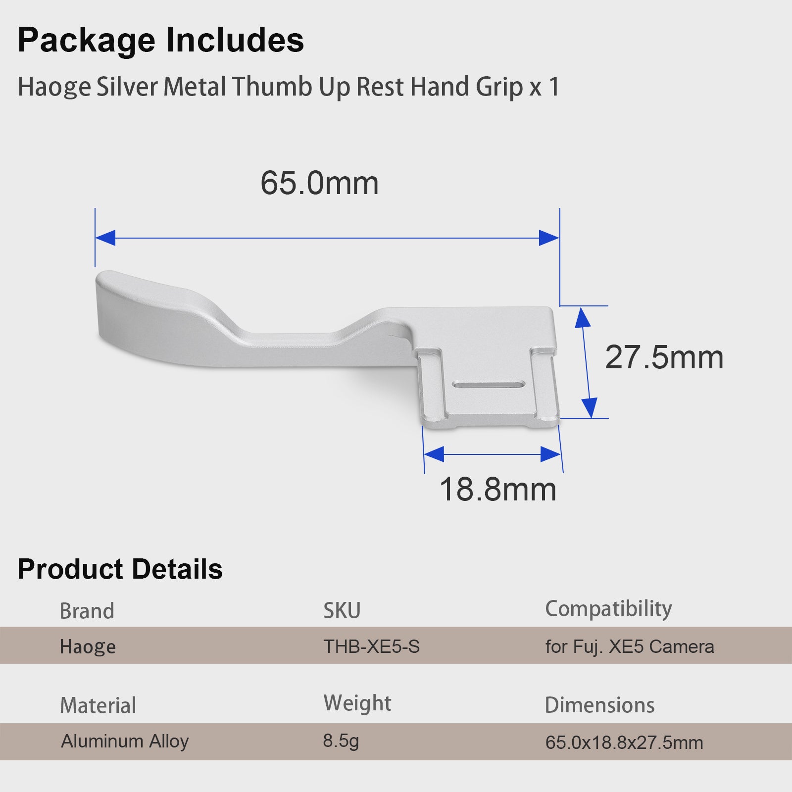 Haoge Metal Thumb Up Grip for Fujifilm X-E5 Camera Digital Accessories xe5 Hot Shoe Thumb Up Rest Support Handgrip Silver THB-XE5-S