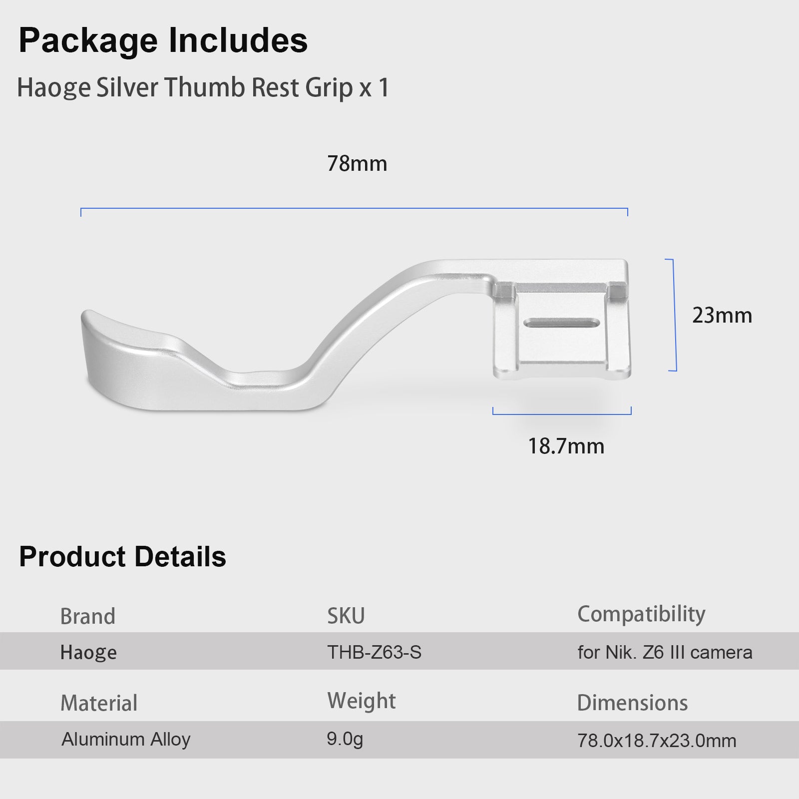 Haoge Metal Thumb Up Rest Hand Grip for Nikon Z6III Z63 Mirrorless Camera Accessories Silver THB-Z63-S Hot Shoe Thumb Up Grip