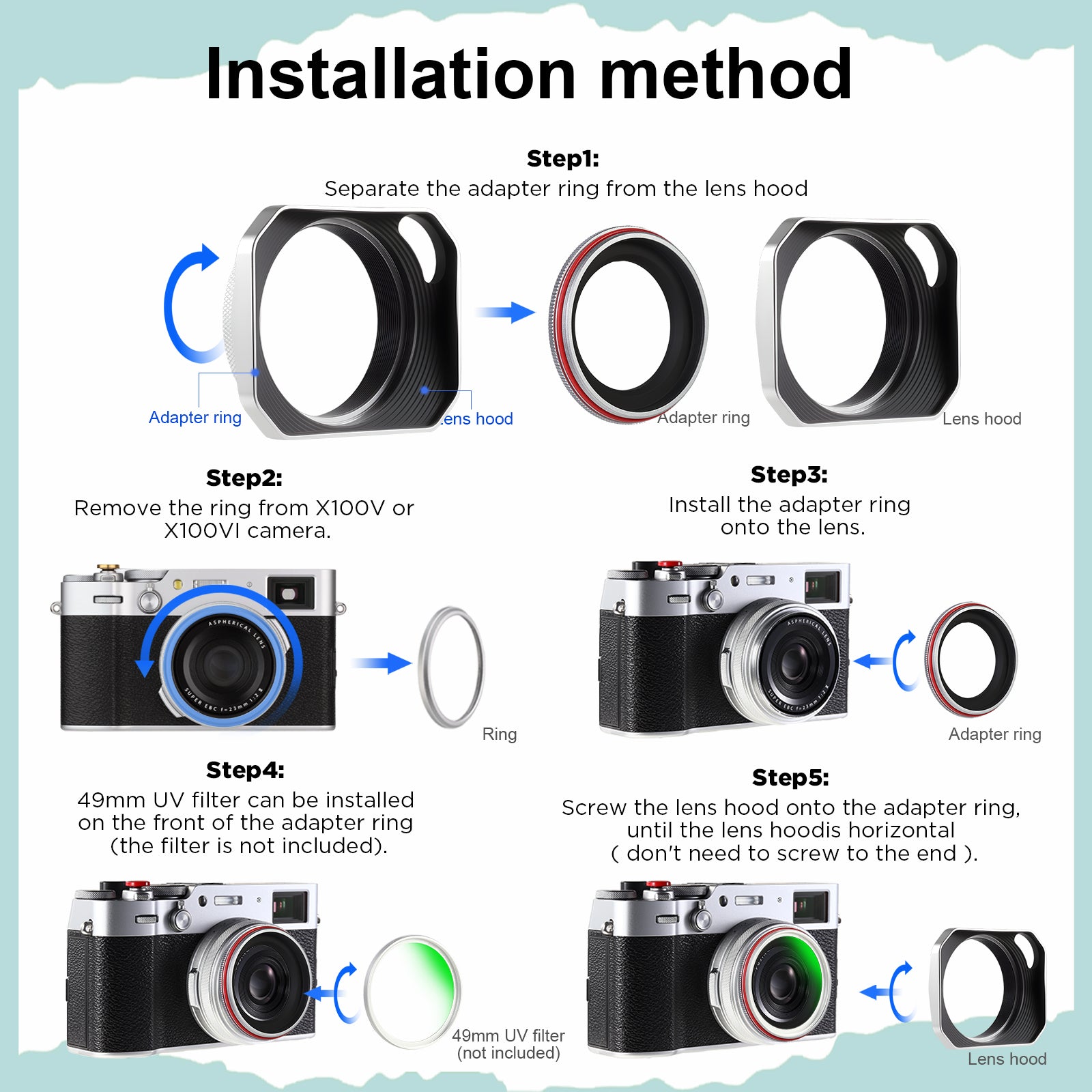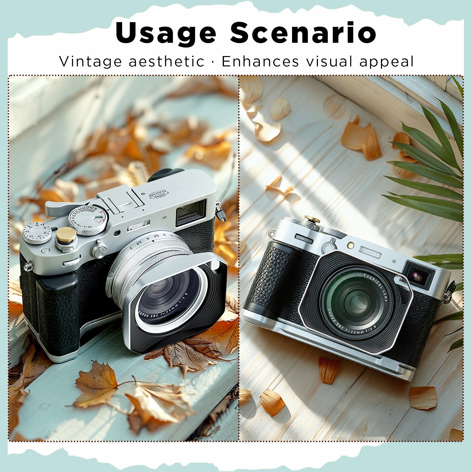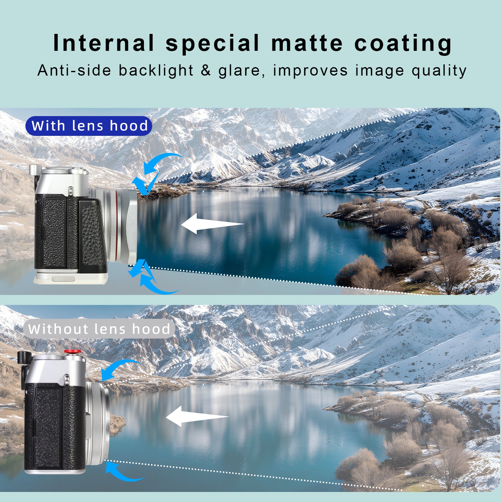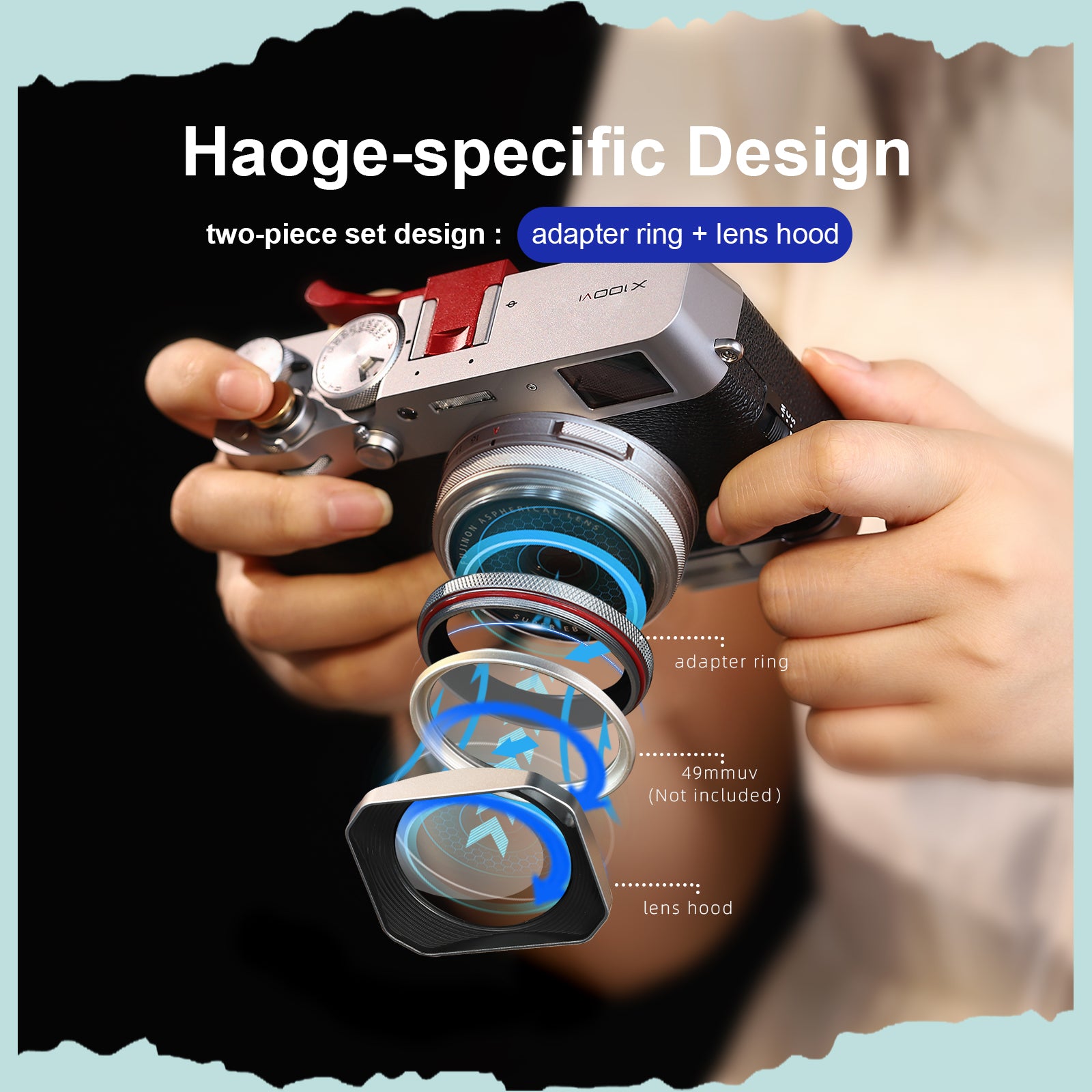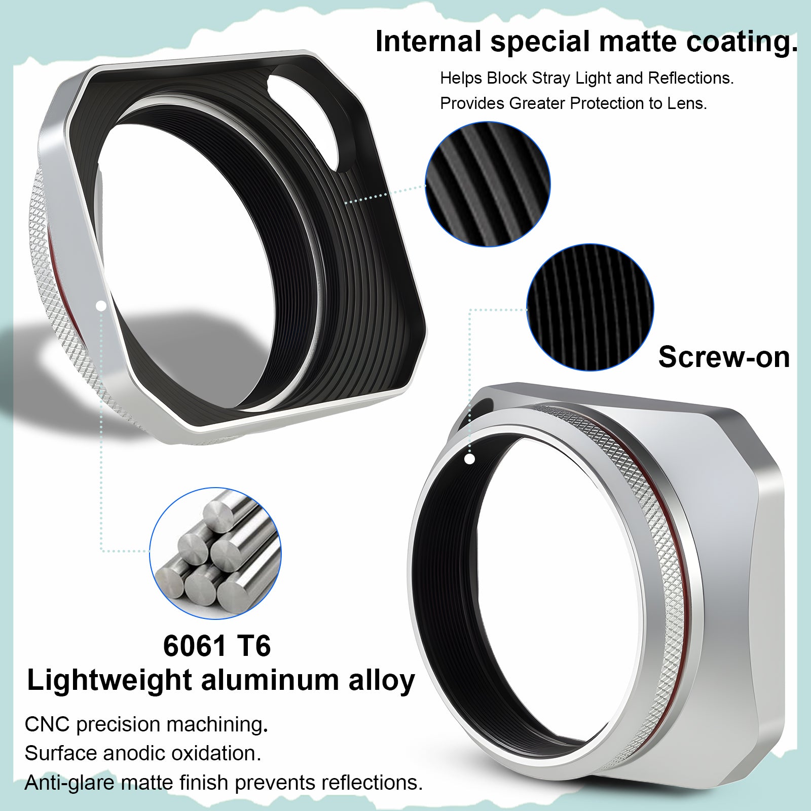 Haoge Square Metal Lens Hood specially designed for Fujifilm X100VI X100V X100F X100T X100S X70 series camera,hollow out designed . The lens hood shades the lens from stray light, prevent or limit lens flare, improving your contrast and image quality. Provide additional protection to the camera and lens from accident scratching.