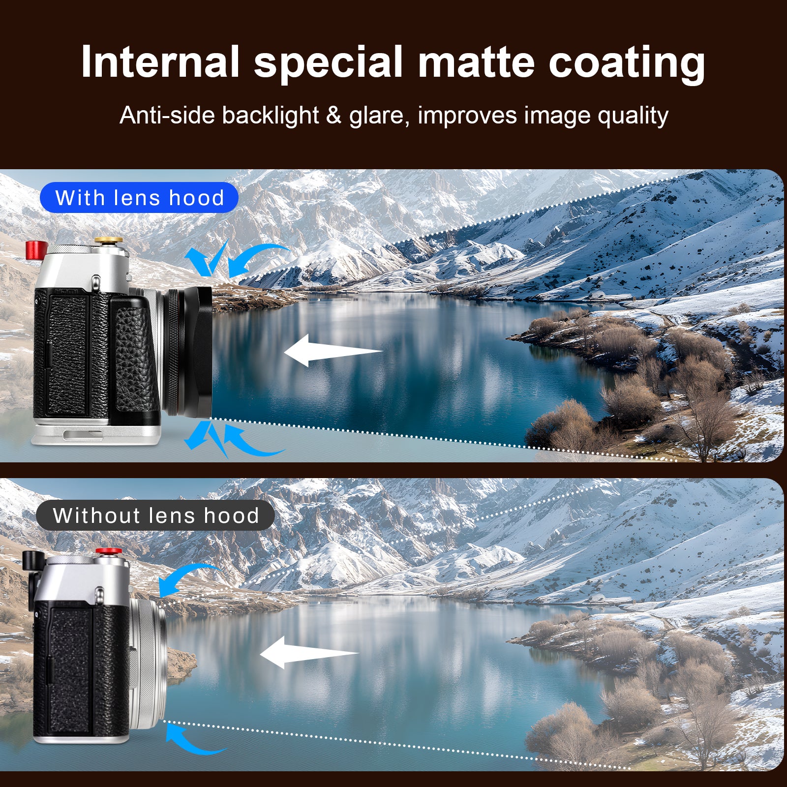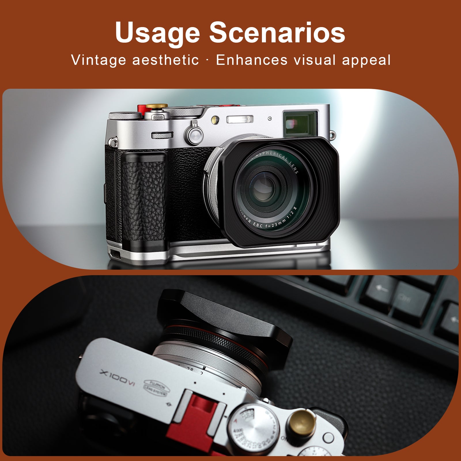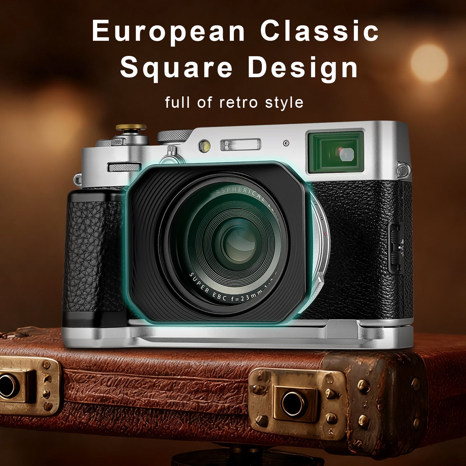 Haoge Square Metal Lens Hood specially designed for Fujifilm X100VI X100V X100F X100T X100S X70 series camera. The lens hood shades the lens from stray light, prevent or limit lens flare, improving your contrast and image quality. Provide additional protection to the camera and lens from accident scratching.