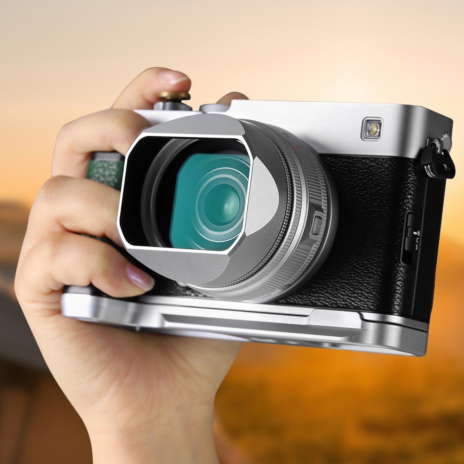 Haoge Squaret Metal Lens Hood for Fujifilm XF23mm F2.8 on XE5 Cemera Body kit Fujinon XF27mmF2.8 R WR Lense 39mm Screw-in Hood Silver ,With Metal Cap
